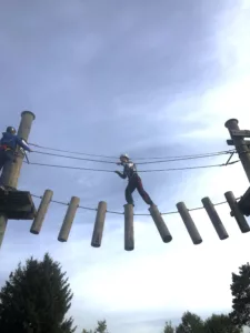 Nach der Anreise mit dem Bus wurde im Sport- und Ferienpark Worriken in Bütgenbach eingecheckt. Gleich nach dem Abendessen ging es dann für einige Jugendliche ins nahegelegene Dorf zur Kirmes. Der erste Tag begann mit einer sportlichen Aktivität im Hochseilgarten. Die Schüler konnten ihre Geschicklichkeit und Konzentration unter Beweis stellen und hatten dabei jede Menge Spaß. Am Nachmittag stand eine Eselwanderung mit der ZFP Schule von Eupen auf dem Programm.