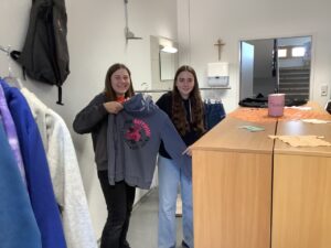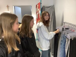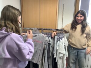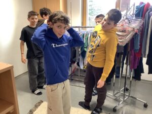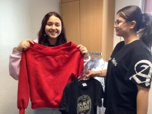 Jetzt wurde dieser Second Love Shop wiedereröffnet. Sehr viele Schülerinnen und Schüler unserer ersten Klassen arbeiteten mit Feuereifer und sehr viel Einsatz daran, teilweise auch in ihrer Freizeit. Sie gestalteten den Raum um, dekorierten, sortierten, putzten und ordneten, um ihn in einer zweiwöchigen Präsentationsphase allen Klassen unserer Schule vorzustellen und wieder in Erinnerung zu bringen. Dazu wurden selbstgebackene Küchlein und Muffins beziehungsweise gesunde Brote serviert. Nun können unsere Schülerinnen und Schüler täglich in den großen Pausen nach Kleidungsstücken stöbern und bei Gefallen mitnehmen oder auch von ihnen nicht mehr geschätzte Textilien abgeben, die dann vom Verkaufsteam begutachtet und einsortiert werden.