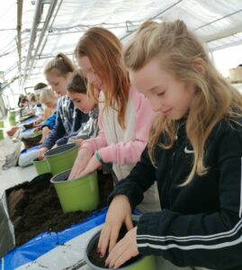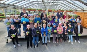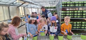 Josef Norz erzählte den Kindern Interessantes über Blumen, Samen, Blüten, Pflanzen und Gemüse. Beim Rundgang durch die Gärtnerei durften die kleinen Gärtnerinnen und Gärtner dann selbst anpacken und ihre eigenen Sonnenblumen anpflanzen.