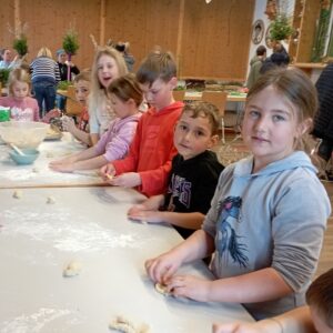 Rechtzeitig vor dem Palmsonntag organisierten die Bäuerinnen das Palmbuschenbinden mit Palmbrezeln backen im Vereinssaal Haimingerberg. Ungefähr vierzig Erwachsene und Kinder kamen, um gemeinsam die Palmlatten zu basteln und zu schmücken. Gegenseitige Unterstützung für jene, die noch nie gebunden haben sowie Tipps und Tricks von den routinierten Palmlattenbindern waren natürlich selbstverständlich. Diesmal hielten wir uns an das traditionelle Binden der Palmlatten mit sieben Pflanzen: mit Thuje, Buchs, Wacholder, Eibe, Ölzweig, Palmkatzeln und “Hoadig”. Die älteren Kinder konnten schon ihre Palmlatten selbst binden. Besonders viele bastelten heuer die „Hexentreppen“ aus zwei verschiedenen Farbbändern, die den Palmbuschen dekorieren. Das Highlight der Kinder war das Backen der eigenen Palmbrezeln, die dann auf den Palmbuschen gebunden oder auch sofort vernascht wurden.
