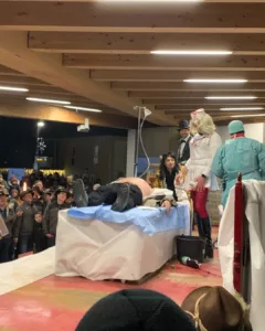 Am Sonntag, den 12. Februar 2023 war es dann so weit. Die Große Fasnacht stand auf dem Programm. Nach dem sehr gut besuchten, spektakulären Hexenfigatter und Bäreneintreiben am Vormittag wurden die Wagen mit großem Aufwand von der Unteren Gmua bzw. dem Parkplatz beim Skaterpark ins Dorf gebracht. Dort stellten sich alle neun Wagen der Reihe nach auf. Erster Schauplatz war bei der Brennerei Wammes, anschließend manövrierte man die Wagen zum Gemeindeplatz.