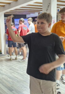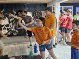 Mara Stigger ist mit ihren inzwischen elf Jahren das jüngste Mitglied des DSV Haiming. Seit ihrem neunten Lebensjahr trainiert sie regelmäßig und nimmt erfolgreich an Turnieren teil. „Hier geht es nicht nur ums Gewinnen, hier steht auch der Spaß im Vordergrund“ erklärt sie fröhlich. Routiniert zeigt sie mir ein paar Grundlagen, damit ich meine ersten Pfeile werfen kann. Was so einfach aussieht, stellt sich doch als gar nicht so leicht heraus. Geduldig erklärt und zeigt sie, wie’s besser funktioniert, von den Spielern rundherum kommen auch viele gute Ratschläge. Die kann ich natürlich nicht alle auf einmal umsetzen – Übung macht schließlich den Meister. Das Gefühl, zwei linke Hände zu haben, verschwindet nach und nach.