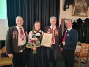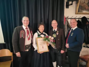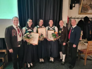 Nach den ausführlichen und informativen Berichten der Funktionäre standen einige Ehrungen auf der Tagesordnung. Schriftführerin Stefanie Scherl erhielt das Ehrenzeichen in Silber für ihre langjährigen Vereinsdienste um das Trachten- und Vereinswesen. Auch vom Bezirks-trachtenverband wurden Ehrungen überreicht. Gleich drei Silbermadln freuten sich über den Bronzenen Latschenzweig. Dazu zählen Martina Föger, Ariane Kapeller und Martina Strigl. Der Goldene Latschenzweig wurde an Angelika Stigger verliehen. Im Anschluss an die Ehrungen kamen die Ehrenmitglieder zu Wort. Nach den allfälligen Wortmeldungen freute man sich über Speis und Trank und ließ den Abend gemütlich ausklingen.
